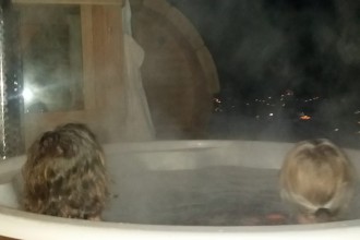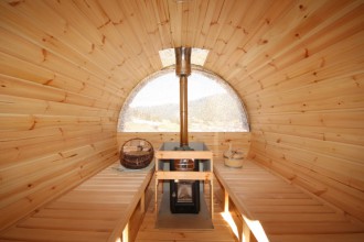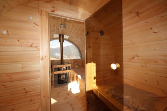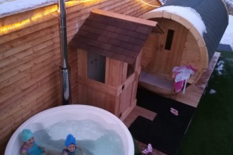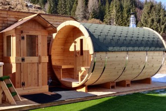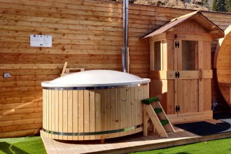 Sulla terrazza solarium esterna abbiamo, una sauna finlandese a botte per 6 persone, una vasca a botte circolare esterna riscaldata (perfetta anche nelle giornate invernali) e una doccia. Un meritato momento di relax con vista panoramica di Padola, e delle sue magnifiche montagne, dal punto più alto del paese.